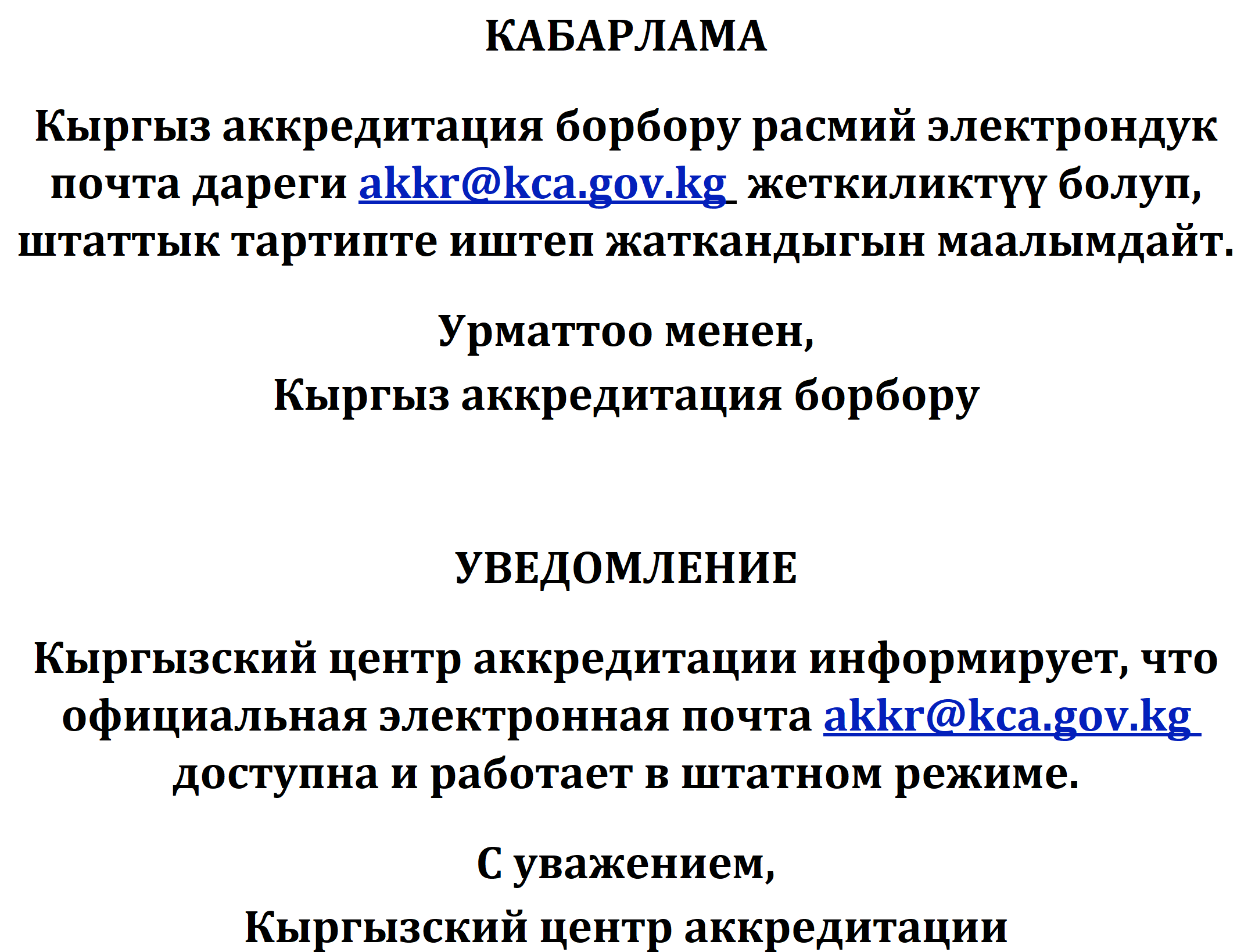 КЦАнын расмий электрондук почтасы штаттык тартипте иштеп жатат